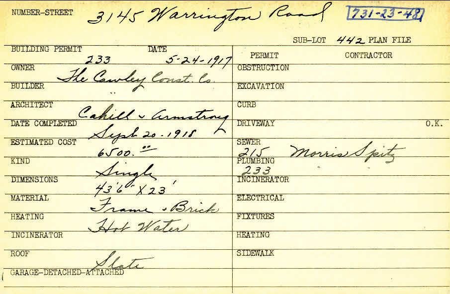 3145 Warrington Road Shaker Heights, OH 44120 PARCEL ID: 731-23-048 Building Permit Date: 05-24-1917 Plan File Number: 91-133 (1-7) all scanned Microfilm Roll: NewRoll01 Neighborhood: Onaway Owner: The Cawley Construction Company Builder: The Cawley Construction Company Architect: Cahill and Armstrong Estimated Cost: 6500 Date Completed: 09-20-1918 Kind: Single, Single Residence or Dwelling Material: Frame and Brick Heating: Hot Water Roof: Slate |