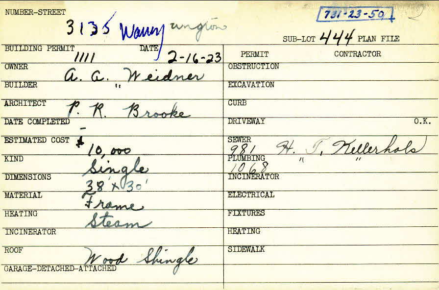 3135 Warrington Road Shaker Heights, OH 44120 PARCEL ID: 731-23-050 Building Permit Date: 02-16-1923 Plan File Number: 0 Neighborhood: Onaway Owner: Weidner, A. A. Builder: Weidner, A. A. Architect: Brooke, Philo R. Estimated Cost: 10000 Kind: Single, Single Residence or Dwelling Material: Frame Heating: Steam Roof: Wood Shingle |