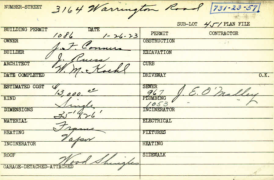 3164 Warrington Road Shaker Heights, OH 44120 PARCEL ID: 731-23-057 Building Permit Date: 01-26-1923 Plan File Number: 0 Neighborhood: Onaway Owner: Conners, J. F. Builder: Ruess, J. Architect: Koehl, W. M. Estimated Cost: 13000 Kind: Single, Single Residence or Dwelling Material: Frame Heating: Vapor Roof: Wood Shingle |