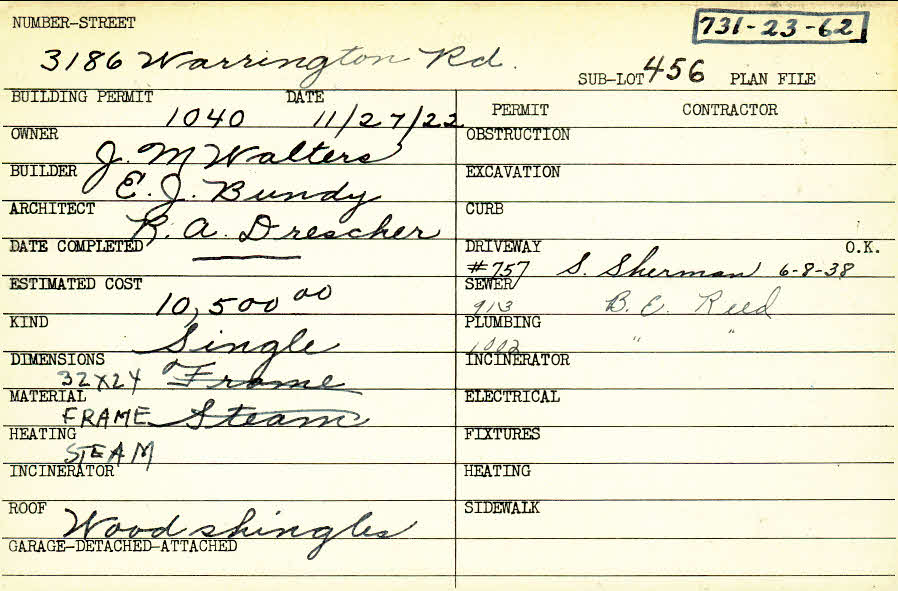 3186 Warrington Road Shaker Heights, OH 44120 PARCEL ID: 731-23-062 Building Permit Date: 11-27-1922 Plan File Number: 2572 Microfilm Roll: Roll #36 Neighborhood: Onaway Owner: Walters, J. M. Builder: Bundy, E. J. Architect: Drescher, Alfred A. Estimated Cost: 10500 Kind: Single, Single Residence or Dwelling Material: Frame Heating: Steam Roof: Wood Shingle |