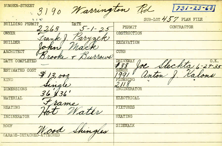 3190 Warrington Road Shaker Heights, OH 44120 PARCEL ID: 731-23-063 Building Permit Date: 05-01-1925 Plan File Number: 0 Neighborhood: Onaway Owner: Paryzek, Frank J. Builder: Mack, John Architect: Brooke and Burrows Estimated Cost: 13000 Kind: Single, Single Residence or Dwelling Material: Frame Heating: Hot Water Roof: Wood Shingle Card Available: yes |