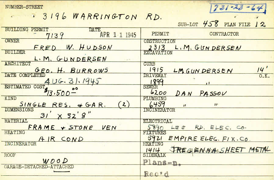 3196 Warrington Road Shaker Heights, OH 44120 PARCEL ID: 731-23-064 Building Permit Date: 04-11-1945 Plan File Number: 12 scanned, 1950, 2457 scanned, 2703, 3160, 3697, 6554, 12035 Microfilm Roll: Roll001, Roll#29, Roll035, Roll #37, Roll#44, Roll#55, Roll#86, NewRoll#10 Neighborhood: Onaway Owner: Hudson, Fred W. Builder: Gundersen, L. M. Architect: Burrows, George H. Estimated Cost: 13500 Date Completed: 08-31-1945 Kind: Single Dwelling and Garage (2) Material: Frame and Stone Veneer Heating: Air Conditioned Roof: Wood Garage: attached |
