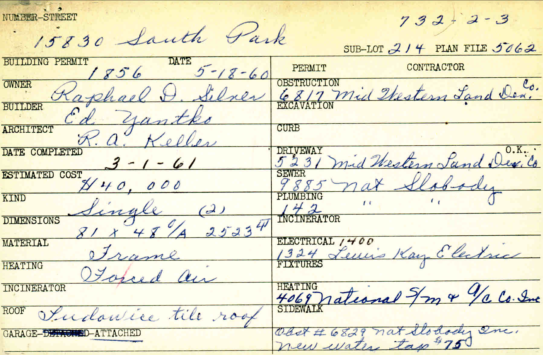 15830 South Park Boulevard Shaker Heights, OH 44120 PARCEL ID: 732-02-003 Building Permit Date: 05-18-1960 Plan File Number: 4467, 5061 Microfilm Roll: Roll#63, Roll#69 Owner: Silner, Raphael D. Builder: Yantko, Ed Architect: Keller, Richard A. Estimated Cost: 40000 Date Completed: 03-01-1961 Kind: Single, Single Residence or Dwelling (2) Material: Frame Heating: Forced Air Roof: Tile Garage: attached Card Available: Yes |