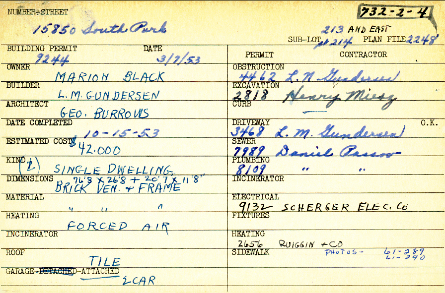 15850 South Park Boulevard Shaker Heights, OH 44120 PARCEL ID: 732-02-004 Building Permit Date: 03-07-1953 Plan File Number: 2248, 7907, 11275 Microfilm Roll: Roll#33, Roll#95, NewRoll#7 Neighborhood: Boulevard Owner: Black, Marion Builder: Gundersen, L. M. Architect: Burrows, George Estimated Cost: 42000 Date Completed: 10-15-1953 Kind: Single, Single Residence or Dwelling (2) Material: Brick Veneer and Frame Heating: Forced Air Roof: Tile Garage: attached 2 car |