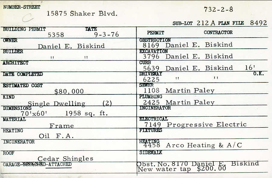 15875 Shaker Boulevard Shaker Heights, OH 44120 PARCEL ID: 732-02-008 Building Permit Date: 09-03-1976 Plan File Number: 8492 Microfilm Roll: Roll#97 Neighborhood: Malvern Owner: Biskind, Daniel E. Builder: Biskind, Daniel E. Estimated Cost: 80000 Kind: Single, Single Residence or Dwelling (2) Material: Frame Heating: Forced Air Roof: Shingles Garage: attached |
