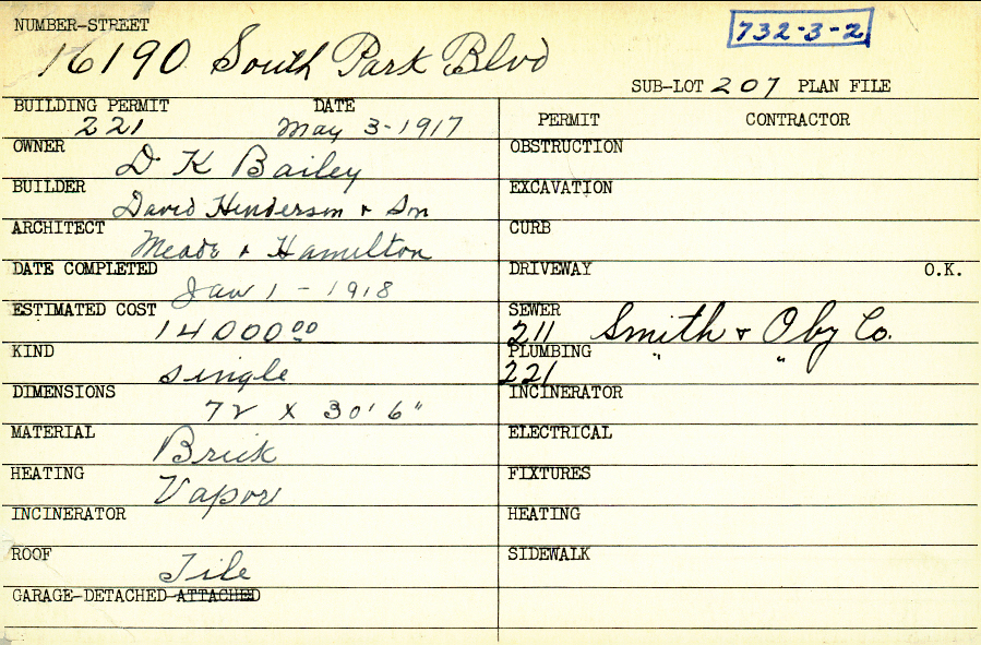 16190 South Park Boulevard Shaker Heights, OH 44120 PARCEL ID: 732-03-002 Building Permit Date: 05-03-1917 Plan File Number: 2051 all scanned Microfilm Roll: Roll031 Owner: Bailey, D. K. Builder: David Henderson and Son Architect: Meade and Hamilton Estimated Cost: 14000 Date Completed: 01-01-1918 Kind: Single, Single Residence or Dwelling Material: Brick Heating: Vapor Roof: Tile Garage: detached Blueprints: online, see link above |