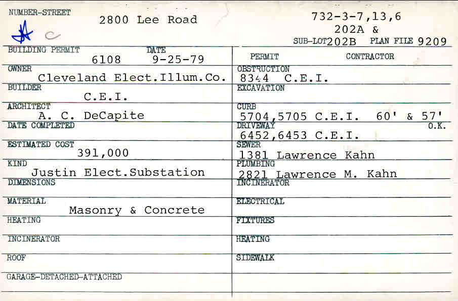 2800 Lee Road Shaker Heights, OH 44120 PARCEL ID: 732-03-006 Building Permit Date: 09-25-1979 Plan File Number: 9209 Microfilm Roll: Roll#102 Neighborhood: Boulevard Owner: Cleveland Electric Illuminating Company Builder: C.E.I. Architect: DeCapite, A. C. Estimated Cost: 391000 Material: Masonry and Concrete |