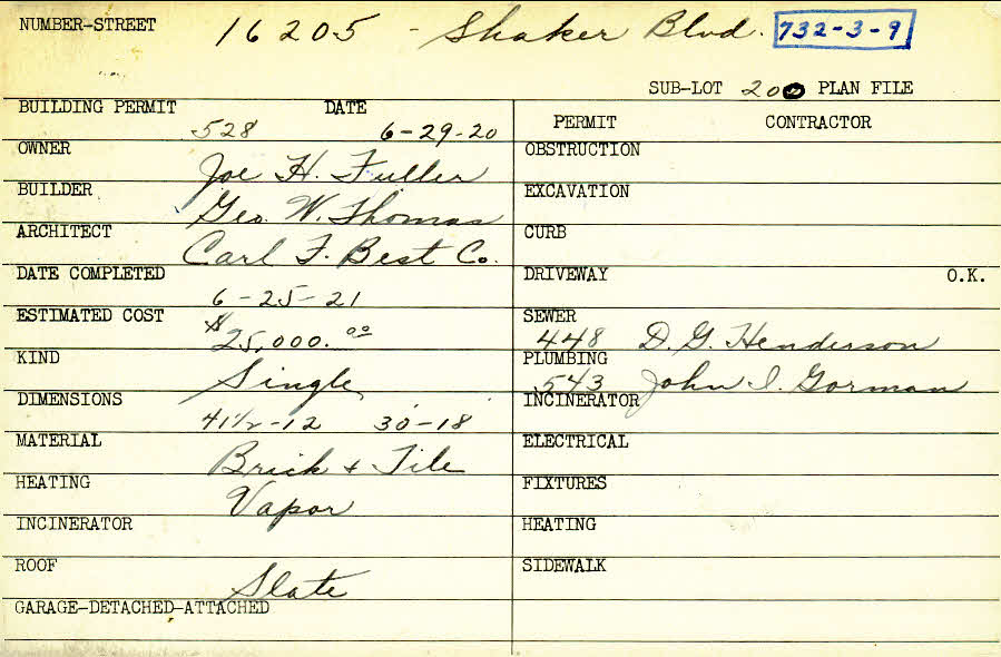 16205 Shaker Boulevard Shaker Heights, OH 44120 PARCEL ID: 732-03-009 Building Permit Date: 06-29-1920 Plan File Number: 1618 all scanned Microfilm Roll: Roll025 Neighborhood: Malvern Owner: Fuller, Joe H. Builder: Thomas, George W. Architect: Carl F. Best Company Estimated Cost: 25000 Date Completed: 06-25-1921 Kind: Single, Single Residence or Dwelling Material: Brick and Tile Heating: Vapor Roof: Slate |