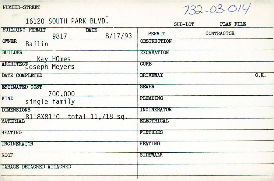 16120 South Park Boulevard Shaker Heights, OH 44120 PARCEL ID: 732-03-014 Building Permit Date: 08-17-1993 Plan File Number: 12864, 13164 scanned Microfilm Roll: NewRoll#18, NewRoll19 Owner: Bailin Builder: Kay Homes Architect: Meyers, Joseph Estimated Cost: 700000 Kind: Single, Single Residence or Dwelling |