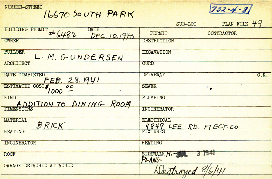 16670 South Park Boulevard Shaker Heights, OH 44120 PARCEL ID: 732-04-008 Building Permit Date: 12-10-1940 Neighborhood: Boulevard Builder: Gundersen, L. M. Estimated Cost: 1000 Date Completed: 02-28-1941 Material: Brick Blueprints: no blueprints on microfilm |