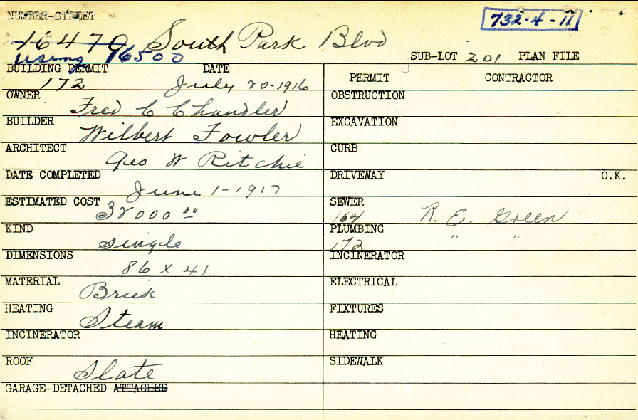 16500 South Park Boulevard Shaker Heights, OH 44120 PARCEL ID: 732-04-011 Building Permit Date: 07-20-1916 Plan File Number: 6380 Microfilm Roll: Roll#85 Neighborhood: Boulevard Owner: Chandler, Fred C. Builder: Fowler, Wilbert Architect: Ritchie, Geo. W. Estimated Cost: 32000 Date Completed: 06-01-1917 Kind: Single, Single Residence or Dwelling Material: Brick Heating: Steam Roof: Slate Garage: detached Card Available: Yes |
