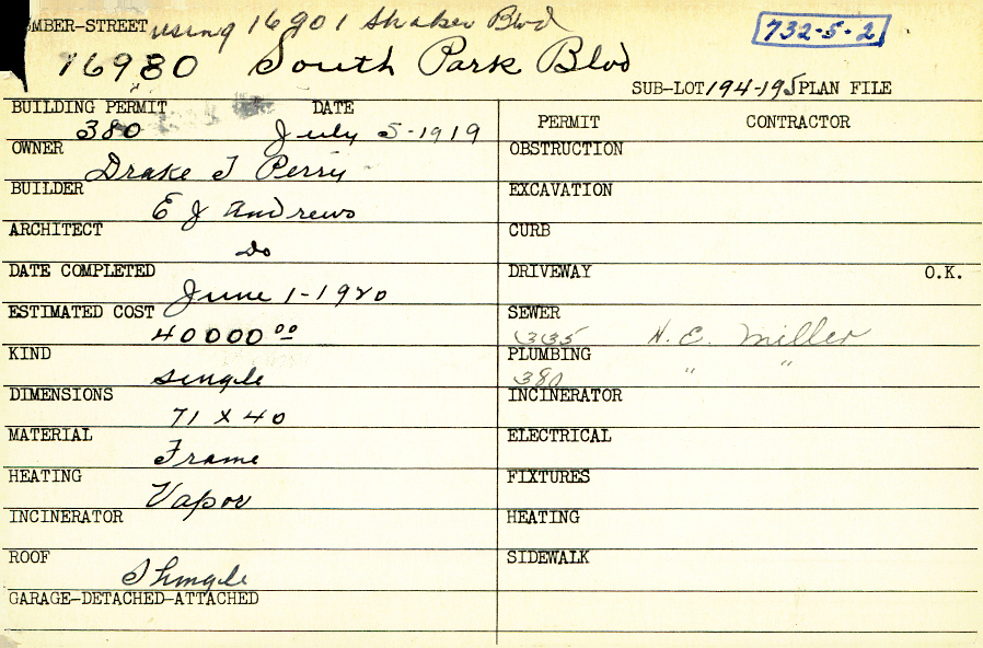 16980 South Park Boulevard Shaker Heights, OH 44120 PARCEL ID: 732-05-002 Building Permit Date: 07-05-1919 Plan File Number: 11816, 12381 Microfilm Roll: NewRoll#9, NewRoll#12 Neighborhood: Boulevard Owner: Perry, Drake T. Builder: Andrews, E. J. Architect: Andrews, E. J. Estimated Cost: 40000 Date Completed: 06-01-1920 Kind: Single, Single Residence or Dwelling Material: Frame Heating: Vapor Roof: Shingles |