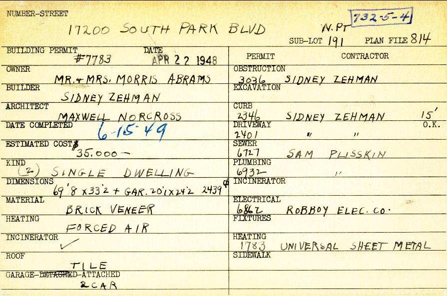 17200 South Park Boulevard Shaker Heights, OH 44120 PARCEL ID: 732-05-004 Building Permit Date: 04-22-1948 Plan File Number: 814 all scanned Microfilm Roll: Roll011 Neighborhood: Boulevard Owner: Abrams, Mr. and Mrs. Morris Builder: Zehman, Sidney Architect: Norcross, Maxwell Estimated Cost: 35000 Date Completed: 06-15-1949 Kind: Single, Single Residence or Dwelling (2) Material: Brick Veneer Heating: Forced Air Roof: Tile Garage: attached 2 car |