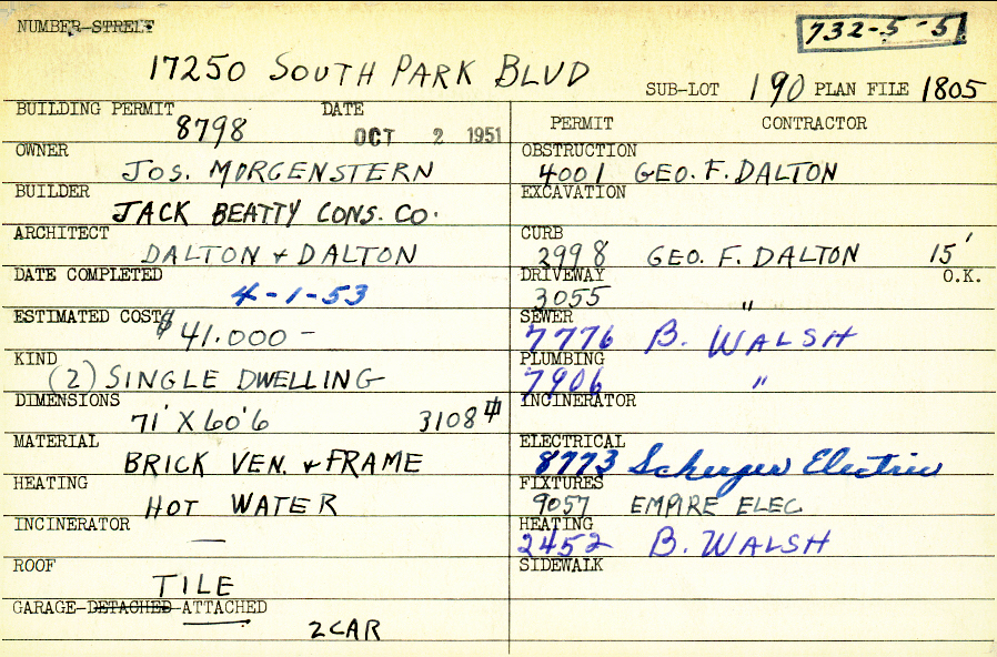 17250 South Park Boulevard Shaker Heights, OH 44120 PARCEL ID: 732-05-005 Building Permit Date: 10-02-1951 Plan File Number: 1805 scanned, 4768 Microfilm Roll: Roll027, Roll#66 Neighborhood: Boulevard Owner: Morgenstern, Joseph Builder: Jack Beatty Construction Company Architect: Dalton and Dalton Estimated Cost: 41000 Date Completed: 04-01-1953 Kind: Single, Single Residence or Dwelling (2) Material: Brick Veneer and Frame Heating: Hot Water Roof: Tile Garage: attached 2 car |
