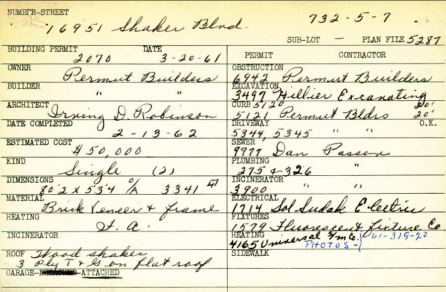 16951 Shaker Boulevard Shaker Heights, OH 44120 PARCEL ID: 732-05-007 Building Permit Date: 03-20-1961 Plan File Number: 5287 Microfilm Roll: Roll#72 Neighborhood: Malvern Owner: Permut Builders Builder: Permut Builders Architect: Robinson, Irving D. Estimated Cost: 50000 Date Completed: 02-13-1962 Kind: Single, Single Residence or Dwelling (2) Material: Brick Veneer and Frame Heating: Forced Air Roof: Wood Shakes Garage: attached |