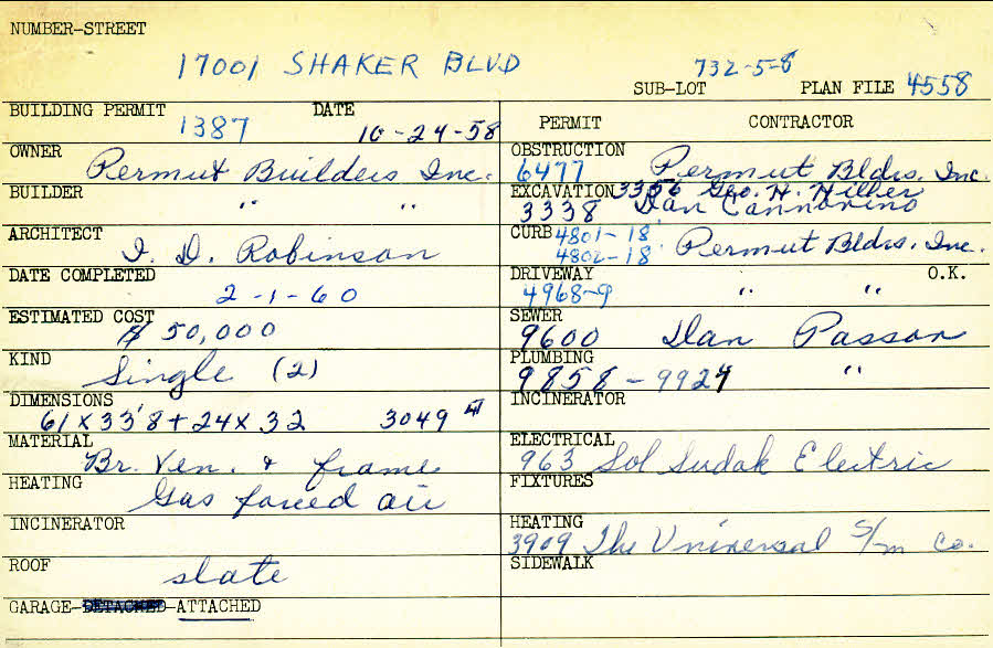 17001 Shaker Boulevard Shaker Heights, OH 44120 PARCEL ID: 732-05-008 Building Permit Date: 10-24-1958 Plan File Number: 4558 Microfilm Roll: Roll#63 Neighborhood: Malvern Owner: Permut Builders Inc. Builder: Permut Builders Inc. Architect: Robinson, I. D. Estimated Cost: 50000 Date Completed: 02-01-1960 Kind: Single, Single Residence or Dwelling (2) Material: Brick Veneer and Frame Heating: Forced Air - Gas Roof: Slate Garage: attached |