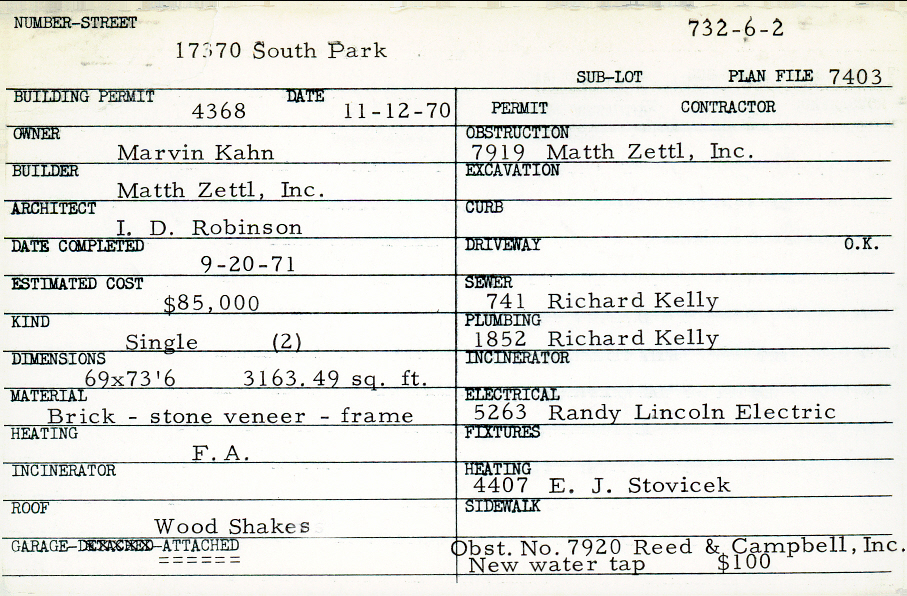 17370 South Park Boulevard Shaker Heights, OH 44120 PARCEL ID: 732-06-002 Building Permit Date: 11-12-1970 Plan File Number: 5842, 7403, 7648, 11354 Microfilm Roll: Roll#79, Roll#92, Roll#94, NewRoll#7 Neighborhood: Boulevard Owner: Kahn, Marvin Builder: Matth Zettl, Inc. Architect: Robinson, I. D. Estimated Cost: 85000 Date Completed: 09-20-1971 Kind: Single, Single Residence or Dwelling (2) Material: Brick, Stone Veneer and Frame Heating: Forced Air Roof: Wood Shakes Garage: attached |