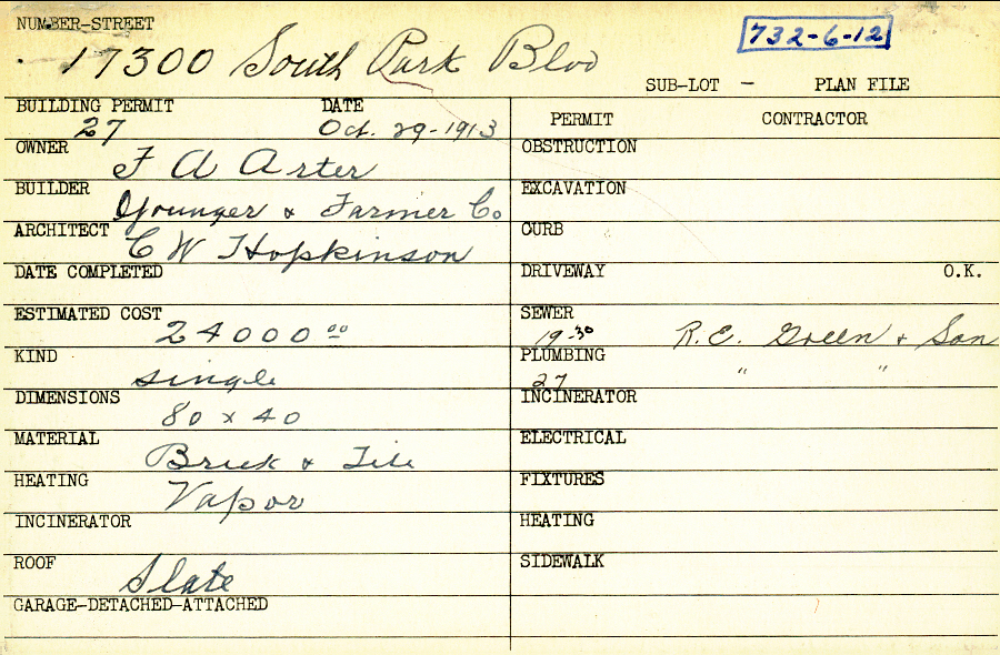 17300 South Park Boulevard Shaker Heights, OH 44120 PARCEL ID: 732-06-012 Building Permit Date: 10-29-1913 Plan File Number: 1888 scanned, 12371, 12405 Microfilm Roll: Roll029, NewRoll#12, NewRoll#13 Neighborhood: Boulevard Owner: Arter, F. A. Builder: Younger and Farmer Company Architect: Hopkinson, C. W. Estimated Cost: 24000 Kind: Single, Single Residence or Dwelling Material: Brick and Tile Heating: Vapor Roof: Slate |