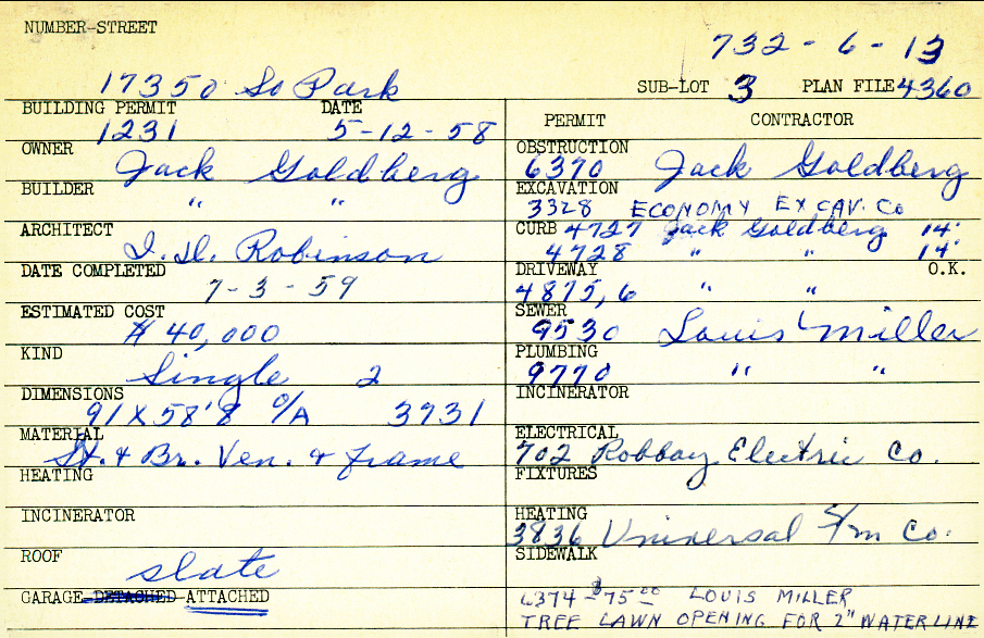 17350 South Park Boulevard Shaker Heights, OH 44120 PARCEL ID: 732-06-013 Building Permit Date: 05-12-1958 Plan File Number: 4360 scanned, 3665, 4540 Microfilm Roll: Roll062, Roll#55, Roll#63 Owner: Goldberg, Jack Builder: Goldberg, Jack Architect: Robinson, I. D. Estimated Cost: 40000 Date Completed: 07-03-1959 Kind: Single, Single Residence or Dwelling (2) Material: Stone and Brick Veneer and Frame Roof: Slate Garage: attached |