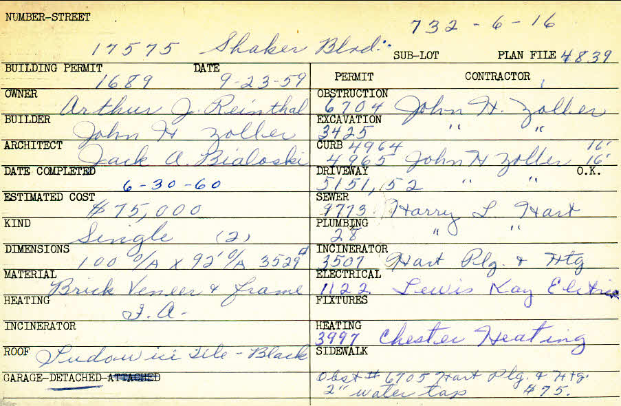 17575 Shaker Boulevard Shaker Heights, OH 44120 PARCEL ID: 732-06-016 Building Permit Date: 09-23-1959 Plan File Number: 4839 Microfilm Roll: Roll#66 Neighborhood: Malvern Owner: Reinthal, Arthur J. Builder: Zoller, John H. Architect: Bialosky, Jack A. Estimated Cost: 75000 Date Completed: 06-30-1960 Kind: Single, Single Residence or Dwelling (2) Material: Brick Veneer and Frame Heating: Forced Air Roof: Tile Garage: detached |