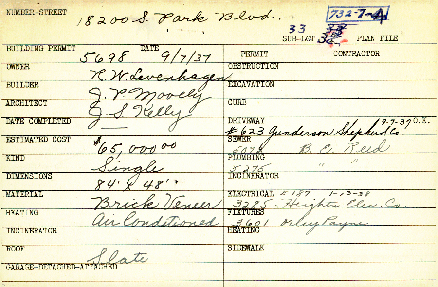 18200 South Park Boulevard Shaker Heights, OH 44120 PARCEL ID: 732-07-004 Building Permit Date: 09-07-1937 Plan File Number: 5081, 5082 all scanned Microfilm Roll: Roll069 Neighborhood: Malvern Owner: Levenhagen, R. W. Builder: Mooely, J. P. Architect: Kelly, John Sherwood Estimated Cost: 65000 Kind: Single, Single Residence or Dwelling Material: Brick Veneer Heating: Air Conditioned Roof: Slate |