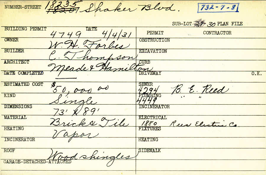 18235 Shaker Boulevard Shaker Heights, OH 44120 PARCEL ID: 732-07-008 Building Permit Date: 04-04-1931 Plan File Number: 0 Neighborhood: Malvern Owner: Forbes, W. H. Builder: Thompson, C. Architect: Meade and Hamilton Estimated Cost: 50000 Kind: Single, Single Residence or Dwelling Material: Brick and Tile Heating: Vapor Roof: Wood Shingle |