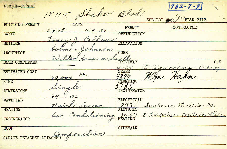 18115 Shaker Boulevard Shaker Heights, OH 44120 PARCEL ID: 732-07-009 Building Permit Date: 11-04-1936 Plan File Number: 10149 Microfilm Roll: New Roll#2 Neighborhood: Malvern Owner: Calhoun, Tracy J. Builder: Holm and Johnson Architect: Smith, Walter Harrison Estimated Cost: 20000 Kind: Single, Single Residence or Dwelling Material: Brick Veneer Heating: Air Conditioned |