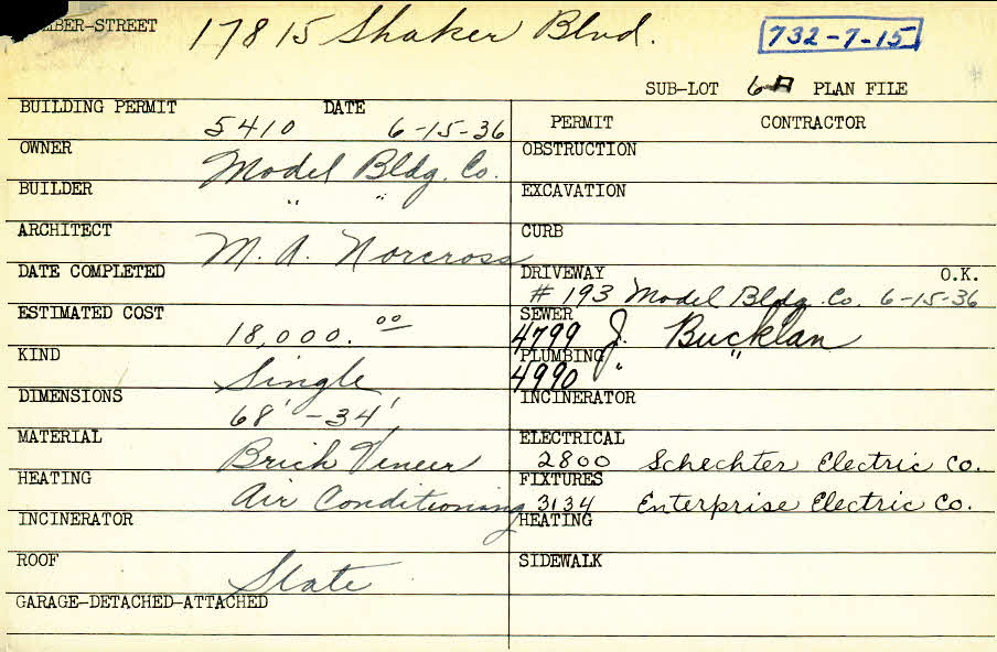 17815 Shaker Boulevard Shaker Heights, OH 44120 PARCEL ID: 732-07-015 Building Permit Date: 06-15-1936 Plan File Number: 10409 Microfilm Roll: NewRoll#4 Neighborhood: Malvern Owner: Model Building Company Builder: Model Building Company Architect: Norcross, M. A. Estimated Cost: 18000 Kind: Single, Single Residence or Dwelling Material: Brick Veneer Heating: Air Conditioned Roof: Slate |