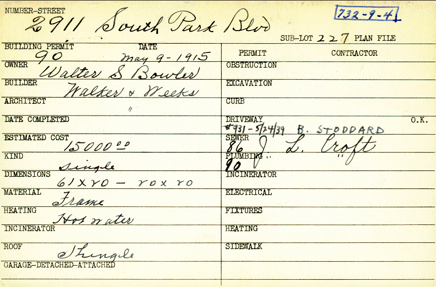 2911 South Park Boulevard Shaker Heights, OH 44120 PARCEL ID: 732-08-004 Building Permit Date: 05-09-1915 Plan File Number: 0 Neighborhood: Boulevard Owner: Bowler, Walter S. Builder: Walker and Weeks Architect: Walker and Weeks Estimated Cost: 15000 Kind: Single, Single Residence or Dwelling Material: Frame Heating: Hot Water Roof: Shingles |