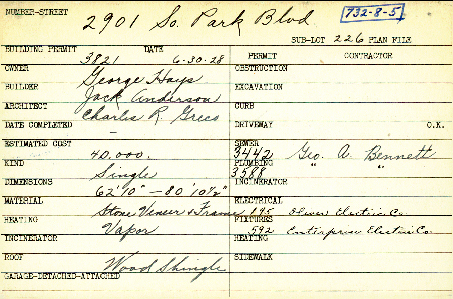 2901 South Park Boulevard Shaker Heights, OH 44120 PARCEL ID: 732-08-005 Building Permit Date: 06-30-1928 Plan File Number: 0 Neighborhood: Boulevard Owner: Hays, George Builder: Anderson, Jack Architect: Greco, Charles R. Estimated Cost: 40000 Kind: Single, Single Residence or Dwelling Material: Stone Veneer and Frame Heating: Vapor Roof: Wood Shingle Card Available: yes |