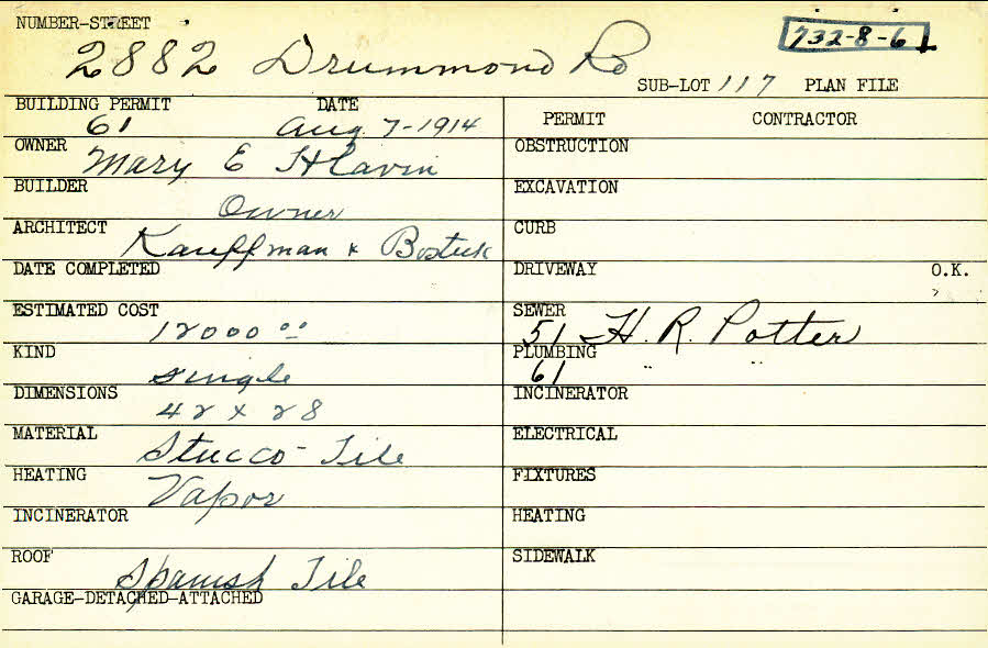 2882 Drummond Road Shaker Heights, OH 44120 PARCEL ID: 732-08-006 Building Permit Date: 08-07-1914 Plan File Number: 0 Neighborhood: Boulevard Owner: Hlavin, Mary E. Builder: Hlavin, Mary E. Architect: Kauffman and Bostick Estimated Cost: 12000 Kind: Single, Single Residence or Dwelling Material: Stucco Tile Heating: Vapor Roof: Tile |