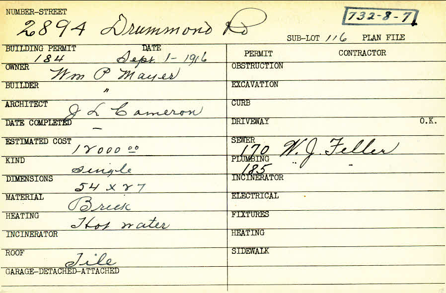 2894 Drummond Road Shaker Heights, OH 44120 PARCEL ID: 732-08-007 Building Permit Date: 09-01-1916 Plan File Number: 0 Neighborhood: Boulevard Owner: Mayer, William P. Builder: Mayer, William P. Architect: Cameron, J. L. Estimated Cost: 12000 Kind: Single, Single Residence or Dwelling Material: Brick Heating: Hot Water Roof: Tile |