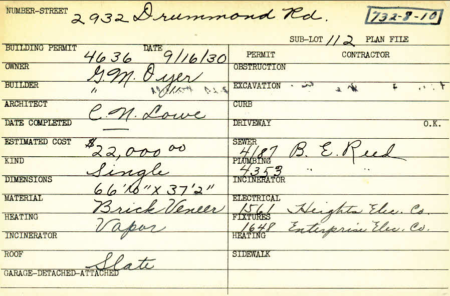 2932 Drummond Road Shaker Heights, OH 44120 PARCEL ID: 732-08-010 Building Permit Date: 09-16-1930 Plan File Number: 0 Neighborhood: Boulevard Owner: Oyer, G. M. Builder: Oyer, G. M. Architect: Lowe, C. N. Estimated Cost: 22000 Kind: Single, Single Residence or Dwelling Material: Brick Veneer Heating: Vapor Roof: Slate Card Available: yes |
