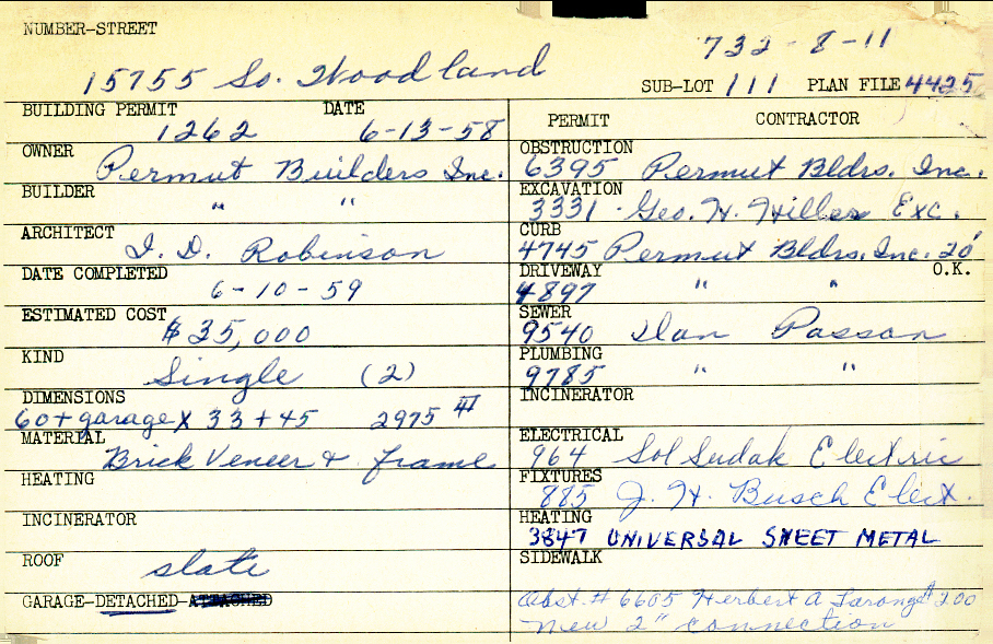 15755 South Woodland Road Shaker Heights, OH 44120 PARCEL ID: 732-08-011 Building Permit Date: 06-13-1958 Plan File Number: 4425 Microfilm Roll: Roll#63 Neighborhood: Boulevard Owner: Permut Builders Inc. Builder: Permut Builders Inc. Architect: Robinson, I. D. Estimated Cost: 35000 Date Completed: 06-10-1959 Kind: Single, Single Residence or Dwelling (2) Material: Brick Veneer and Frame Roof: Slate Garage: detached |