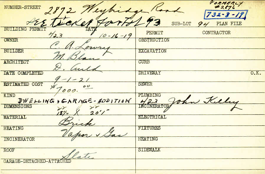 2872 Weybridge Road Shaker Heights, OH 44120 PARCEL ID: 732-08-019 Building Permit Date: 10-16-1919 Plan File Number: 0 Neighborhood: Boulevard Owner: Lowry, C. A. Builder: Blau, M. Architect: Auld, D. Estimated Cost: 7000 Date Completed: 09-01-1921 Kind: Single Dwelling and Garage Material: Brick Heating: Vapor Roof: Slate |