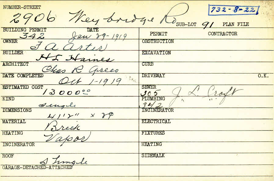 2906 Weybridge Road Shaker Heights, OH 44120 PARCEL ID: 732-08-022 Building Permit Date: 01-29-1919 Plan File Number: 0 Neighborhood: Boulevard Owner: Arter, F. A. Builder: Haines, H. L. Architect: Greco, Charles R. Estimated Cost: 13000 Date Completed: 10-01-1919 Kind: Single, Single Residence or Dwelling Material: Brick Heating: Vapor Roof: Shingles |