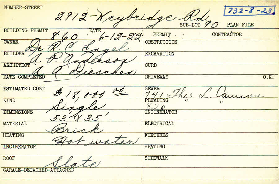 2912 Weybridge Road Shaker Heights, OH 44120 PARCEL ID: 732-08-023 Building Permit Date: 06-12-1922 Plan File Number: 0 Neighborhood: Boulevard Owner: Engel, Dr. R. C. Builder: Anderson, A. P. Architect: Dieschen, A. A. Estimated Cost: 18000 Kind: Single, Single Residence or Dwelling Material: Brick Heating: Hot Water Roof: Slate Card Available: yes |
