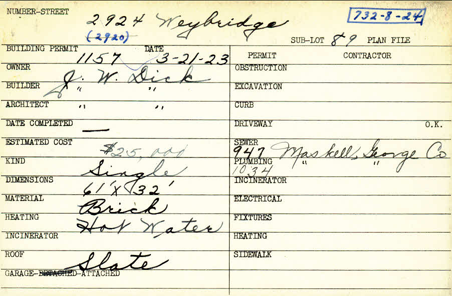 2924 Weybridge Road Shaker Heights, OH 44120 PARCEL ID: 732-08-024 Building Permit Date: 03-21-1923 Plan File Number: 0 Neighborhood: Boulevard Owner: Dick, J. W. Builder: Dick, J. W. Architect: Dick, J. W. Estimated Cost: 25000 Kind: Single, Single Residence or Dwelling Material: Brick Heating: Hot Water Roof: Slate Garage: attached |
