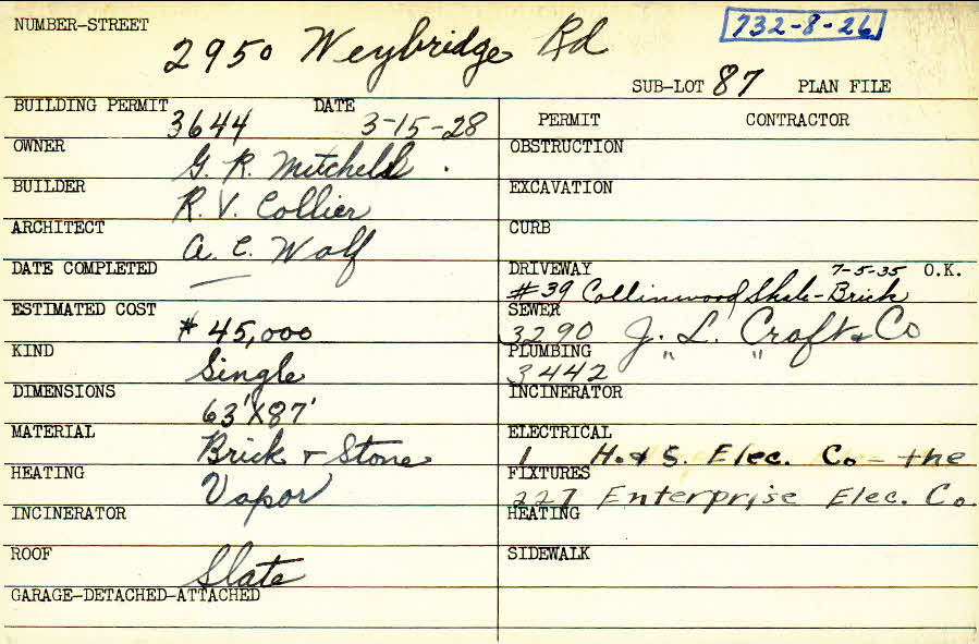 2950 Weybridge Road Shaker Heights, OH 44120 PARCEL ID: 732-08-026 Building Permit Date: 03-15-1928 Plan File Number: 6889 Microfilm Roll: Roll#89 Neighborhood: Boulevard Owner: Mitchell, G. R. Builder: Collier, R. V. Architect: Wolf, A. C. Estimated Cost: 45000 Kind: Single, Single Residence or Dwelling Material: Brick and Stone Heating: Vapor Roof: Slate |
