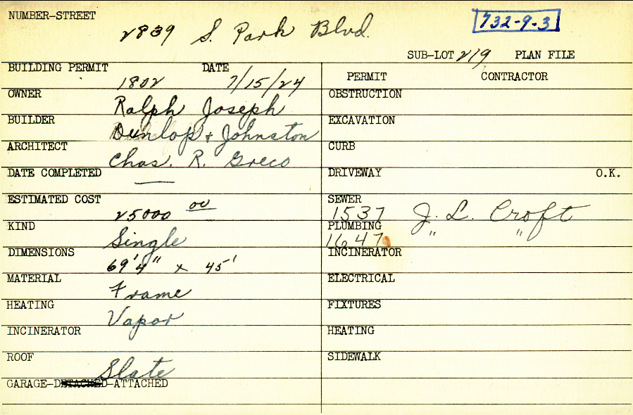 2839 South Park Boulevard Shaker Heights, OH 44120 PARCEL ID: 732-09-003 Building Permit Date: 07-15-1924 Plan File Number: 6959 Microfilm Roll: Roll#90 Neighborhood: Boulevard Owner: Joseph, Ralph Builder: Dunlop and Johnston Architect: Greco, Charles R. Estimated Cost: 25000 Kind: Single, Single Residence or Dwelling Material: Frame Heating: Vapor Roof: Slate Garage: attached |