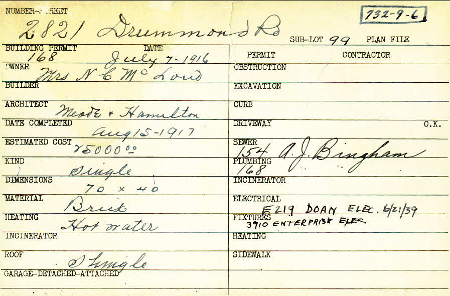 2821 Drummond Road Shaker Heights, OH 44120 PARCEL ID: 732-09-006 Building Permit Date: 07-07-1916 Plan File Number: 7363 Microfilm Roll: Roll#92 Neighborhood: Boulevard Owner: McLoud, Mrs. N. C. Architect: Meade and Hamilton Estimated Cost: 25000 Date Completed: 08-15-1917 Kind: Single, Single Residence or Dwelling Material: Brick Heating: Hot Water Roof: Shingles |
