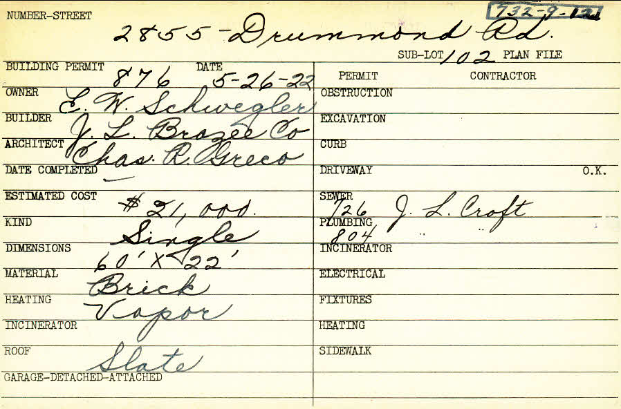 2855 Drummond Road Shaker Heights, OH 44120 PARCEL ID: 732-09-012 Building Permit Date: 05-26-1922 Plan File Number: 0 Neighborhood: Boulevard Owner: Schwegler, E. W. Builder: J. L. Brasee Company Architect: Greco, Charles R. Estimated Cost: 21000 Kind: Single, Single Residence or Dwelling Material: Brick Heating: Vapor Roof: Slate |