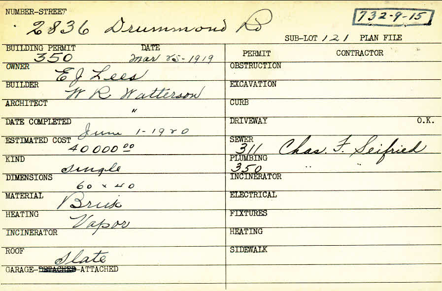 2836 Drummond Road Shaker Heights, OH 44120 PARCEL ID: 732-09-015 Building Permit Date: 03-25-1919 Plan File Number: 7051, 11671 all scanned Microfilm Roll: Roll090, NewRoll08 Neighborhood: Boulevard Owner: Lees, E. J. Builder: Watterson, W. R. Architect: Watterson, W. R. Estimated Cost: 40000 Date Completed: 06-01-1920 Kind: Single, Single Residence or Dwelling Material: Brick Heating: Vapor Roof: Slate Garage: attached Blueprints: online, see link above |