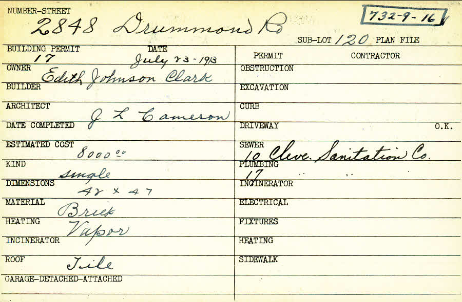 2848 Drummond Road Shaker Heights, OH 44120 PARCEL ID: 732-09-016 Building Permit Date: 07-23-1913 Plan File Number: 0 Neighborhood: Boulevard Owner: Clark, Edith Johson Architect: Cameron, J. L. Estimated Cost: 8000 Kind: Single, Single Residence or Dwelling Material: Brick Heating: Vapor Roof: Tile Card Available: yes |