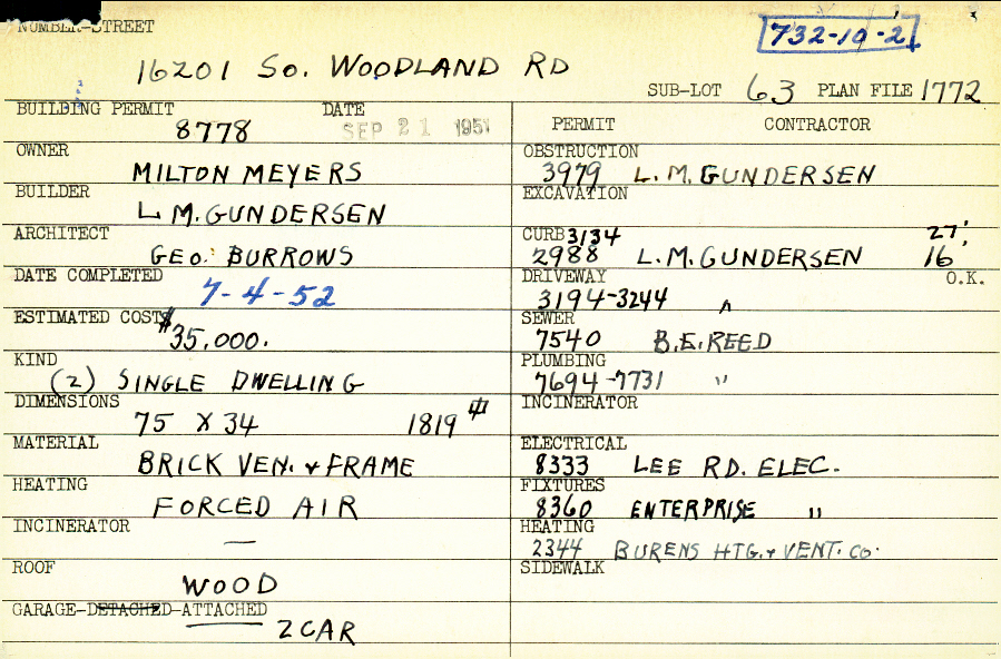 16201 South Woodland Road Shaker Heights, OH 44120 PARCEL ID: 732-10-002 Building Permit Date: 09-21-1951 Plan File Number: 1772 scanned, 5802, 6903, 7144 Microfilm Roll: Roll26A, Roll#78, Roll#90, Roll#91 Neighborhood: Boulevard Owner: Meyers, Milton Builder: Gundersen, L. M. Architect: Burrows, George Estimated Cost: 35000 Date Completed: 07-04-1952 Kind: Single, Single Residence or Dwelling (2) Material: Brick Veneer and Frame Heating: Forced Air Roof: Wood Garage: attached 2 car |
