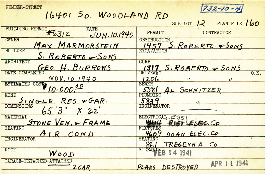 16401 South Woodland Road Shaker Heights, OH 44120 PARCEL ID: 732-10-004 Building Permit Date: 06-10-1940 Plan File Number: 160, 5708, 7788 Microfilm Roll: Roll#77, Roll#94 Neighborhood: Boulevard Owner: Marmorstein, Max Builder: S. Roberto and Sons Architect: Burrows, George H. Estimated Cost: 10000 Date Completed: 11-10-1940 Kind: Single Dwelling and Garage Material: Stone Veneer and Frame Heating: Air Conditioned Roof: Wood Garage: attached 2 car |