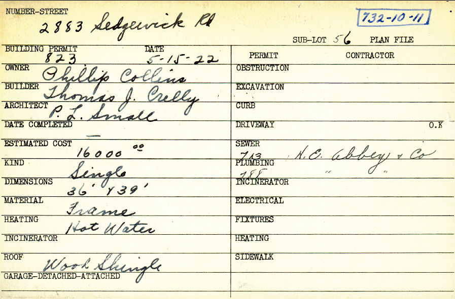 2883 Sedgewick Road Shaker Heights, OH 44120 PARCEL ID: 732-10-011 Building Permit Date: 05-15-1922 Plan File Number: 0 Neighborhood: Boulevard Owner: Collins, Phillip Builder: Crelly, Thomas J. Architect: Small, P. L. Estimated Cost: 16000 Kind: Single, Single Residence or Dwelling Material: Frame Heating: Hot Water Roof: Wood Shingle |