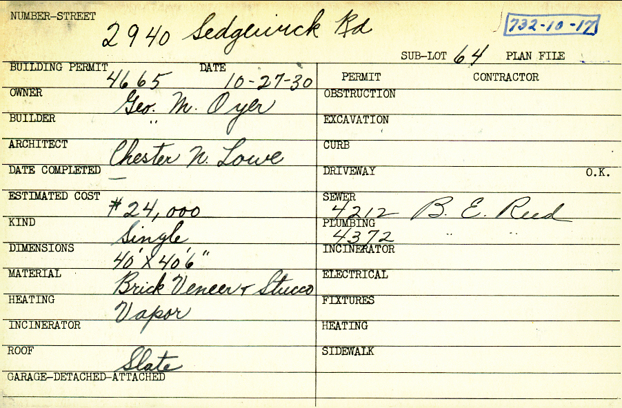 2940 Sedgewick Road Shaker Heights, OH 44120 PARCEL ID: 732-10-017 Building Permit Date: 10-27-1930 Plan File Number: 0 Neighborhood: Boulevard Owner: Oyer, George M. Builder: Oyer, George M. Architect: Lowe, Chester N. Estimated Cost: 24000 Kind: Single, Single Residence or Dwelling Material: Brick Veneer and Stucco Heating: Vapor Roof: Slate |