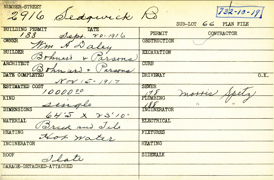 2916 Sedgewick Road Shaker Heights, OH 44120 PARCEL ID: 732-10-019 Building Permit Date: 09-20-1916 Plan File Number: 0 Neighborhood: Boulevard Owner: Daley, William A. Builder: Bohnard and Parsson Architect: Bohnard and Parsson Estimated Cost: 10000 Date Completed: 11-15-1917 Kind: Single, Single Residence or Dwelling Material: Brick and Tile Heating: Hot Water Roof: Slate |