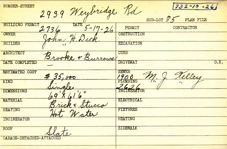 2939 Weybridge Road Shaker Heights, OH 44120 PARCEL ID: 732-10-026 Building Permit Date: 05-17-1926 Plan File Number: 0 Neighborhood: Boulevard Owner: Dick, John H. Builder: Dick, John H. Architect: Brooke and Burrows Estimated Cost: 35000 Kind: Single, Single Residence or Dwelling Material: Brick and Stucco Heating: Hot Water Roof: Slate Card Available: yes |